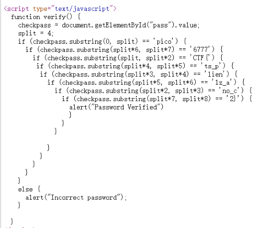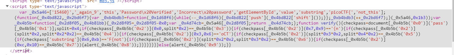 1 2 3 4 5 6 7 8 9 10 11 12 13 14 15 16 17 18 19 20 21 22 23 24 25 26 27 28 29 30 31 32 33 var func = ["getElementById" , "value" , "substring" , "picoCTF{" , "not_this" , "15460}" , "_again_9" , "this" , "Password Verified" , "Incorrect password" ];var data = function (level, ai_test ) { level = level - 0 ; var rowsOfColumns = func[level]; return rowsOfColumns; };function verify ( ) { checkpass = document [data ("0x0" )]("pass" )[data ("0x1" )]; split = 4 ; if (checkpass[data ("0x2" )](0 , split * 2 ) == data ("0x3" )) { if (checkpass[data ("0x2" )](7 , 9 ) == "{n" ) { if (checkpass[data ("0x2" )](split * 2 , split * 2 * 2 ) == data ("0x4" )) { if (checkpass[data ("0x2" )](3 , 6 ) == "oCT" ) { if (checkpass[data ("0x2" )](split * 3 * 2 , split * 4 * 2 ) == data ("0x5" )) { if (checkpass["substring" ](6 , 11 ) == "F{not" ) { if (checkpass[data ("0x2" )](split * 2 * 2 , split * 3 * 2 ) == data ("0x6" )) { if (checkpass[data ("0x2" )](12 , 16 ) == data ("0x7" )) { alert (data ("0x8" )); } } } } } } } } else { alert (data ("0x9" )); } } ;