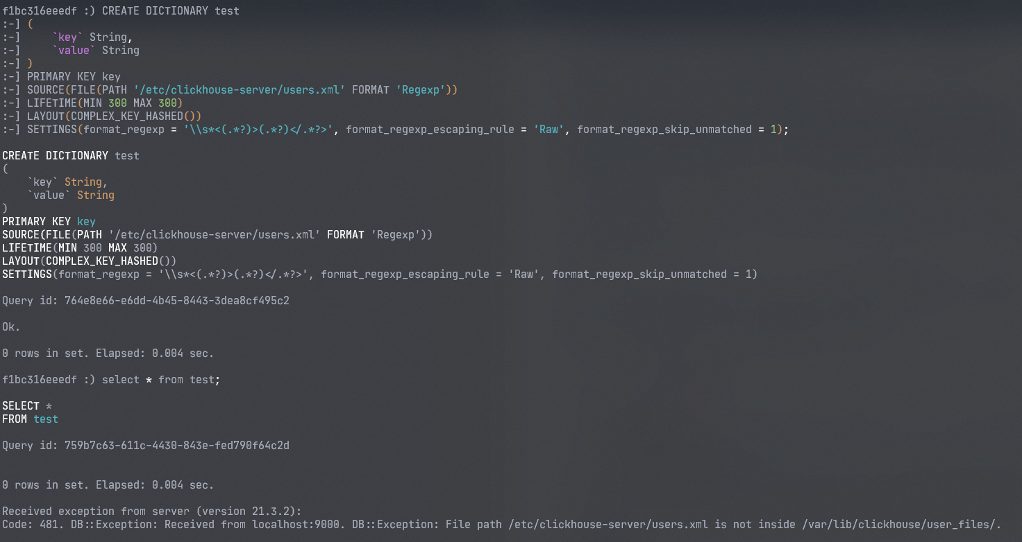 SOURCE(FILE(PATH '/var/lib/clickhouse/user_files/../../../../../etc/clickhouse-server/users.xml' FORMAT 'Regexp'))